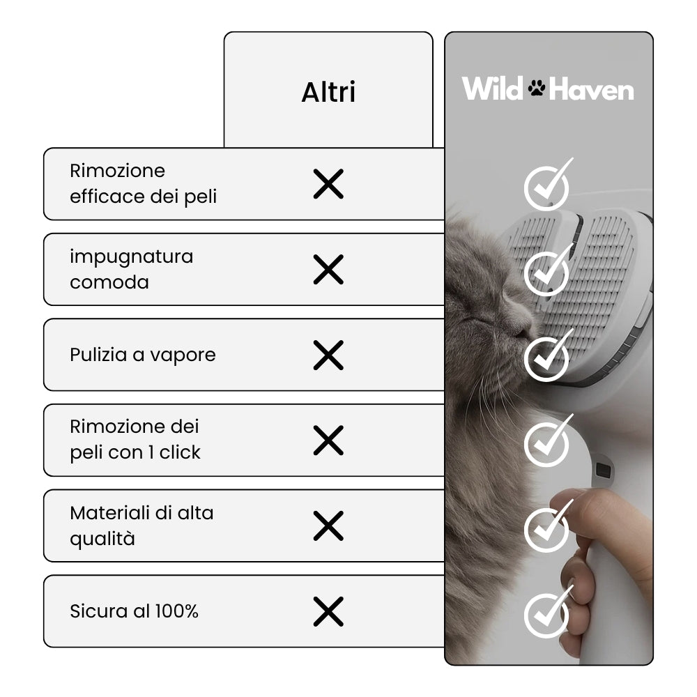 La funzione a vapore igienizza il pelo durante la spazzolatura, eliminando batteri e impurità in modo naturale, senza l’uso di prodotti chimici.