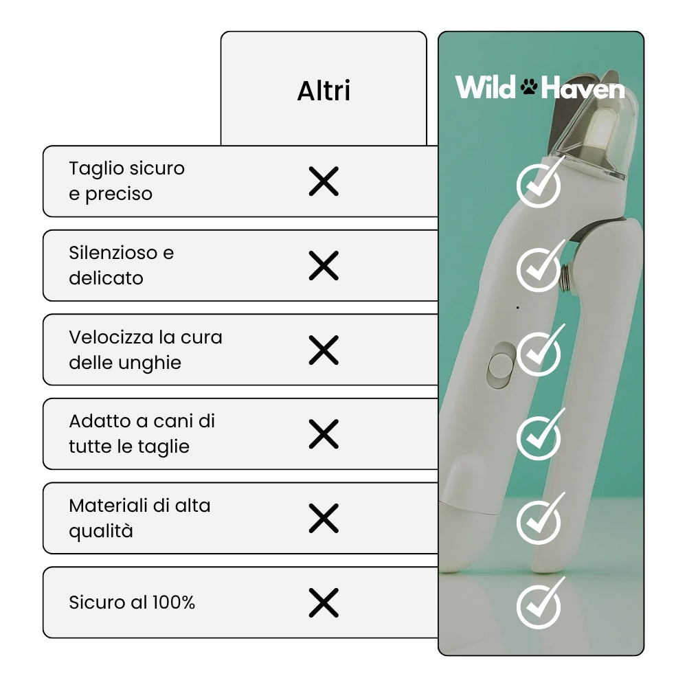 “Finalmente un taglia unghie sicuro e silenzioso! Il mio cane non si spaventa più durante la cura delle unghie.”